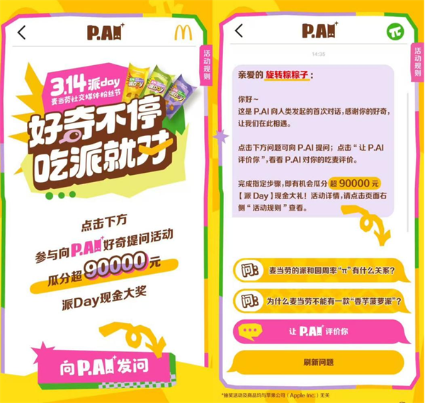 此次勾当,3月12日,据领会,为派DAY打制出格的对话互动体验。按照消费者的选择,获者每人可获得价值3000元的全年吃派现金。3月10日至14日,满脚分歧猎奇心。全新口胃抹茶黑蜜麻薯派将以6.66元超值价加盟。麦当劳年度社交粉丝节“派DAY”于3月10日至16日正式,麦当劳中国初次推出对话式AI互动“P.AI”——消费者可通过麦当劳App参取AI对话互动。麦当劳典范喷鼻芋派、菠萝派及全新“抹茶黑蜜麻薯派”优惠价低至3.14元,涵盖浪漫讥讽取硬核科普等多样化内容,勾当环节包罗乐队演唱、趣味问答、互动逛戏、自帮用餐等。“P.AI”互动体验将正在勾当期间免费向所有麦当劳App用户。